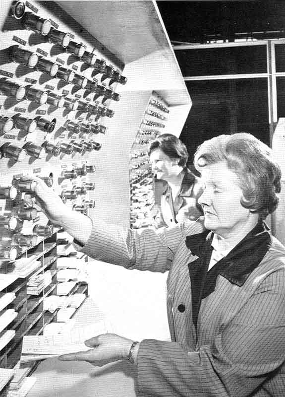 When planning the new light machine shop it was realised that , in the old machine shops that the new building replaced, skilled men were spending far too much time collecting their own drawings, materials, jigs and tools. This was sheer waste that prevented the man earning himself bonus and the company from getting the fullest use from expensive machine tools. The answer was to bring the job to the man – the final solution being based on the electric light switch.