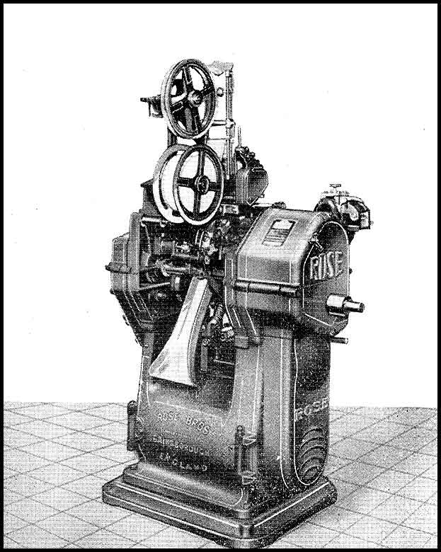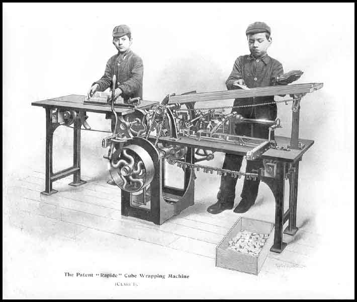 William Rose was something of a boy prodigy – a riveter’s assistant at the age of eleven, he then became a barber’s assistant. It was during his time in the barber’s shop that William first saw the need to sell tobacco in packets. When a customer called for tobacco, the lather-boy had to dry his hands and run to the counter to weigh it out hand and wrap it and he wondered why it could not be sold in packets instead of loose. He resolved to make a Tobacco packaging machine. Entirely self-taught – in his bedroom until late into the night and at weekends, he taught himself the rudiments of mechanical drawing, applied mechanics, mathematics and all the other skills required to develop complex mechanisms - he devised a machine that could quickly wrap half-ounces of loose tobacco into neat cylindrical packages. Trained engineers of later generations marvelled at his ambition and tenacity. It was said that he could hardly have started with a commodity more difficult to pack than tobacco. Sweet wrapping machines are much simpler mechanisms than the original tobacco packer with which William Rose “established the basic principles of automatic wrapping of later years”. After becoming owner of the barber’s shop, he continued to work at his models – “with neither equipment or resources, only mechanical problems, financial troubles – and heaps of ridicule”. It took seven years of effort before he completed a machine that did what he wanted, and he took it to the old-established tobacco firm of Wills in Bristol. This proved a very wise move as in their joint names, a patent was taken out in 1885 (Wills later renounced all claims to the patent rights).