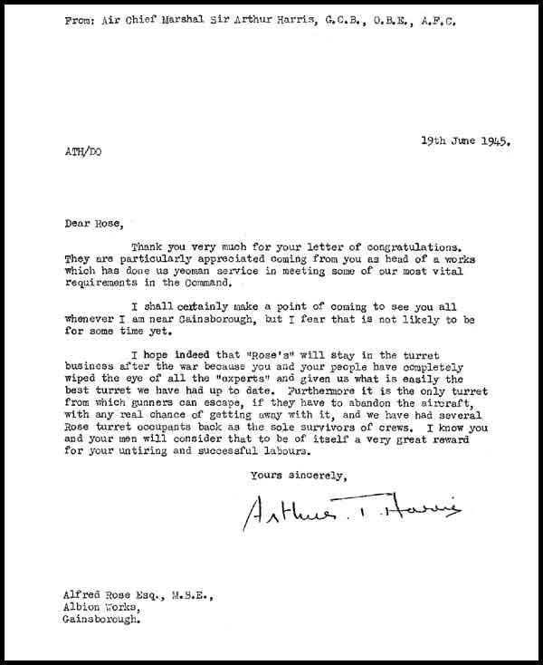 Some of Alfred Rose's finest hours could be said to have come during the dark days of WW2. His father had earned a reputation for accepting orders for machines irrespective of how difficult they might be to execute, and with little worry whether or not they would earn a normal profit. He was much more concerned with retaining his highly skilled craftsmen and achieving high engineering standards and thus he was able to turn with confidence to the production of war materials. A fuller account of the contribution made by Rose to the war effort can be found in Chapter 21 – "Equipping the Services" - in Augustus Muir's "History of Baker Perkins". Suffice it to say that the company's considerable energy and ingenuity was put towards developing pom-pom directors, gun sights, trench mortar and Stiffkey sights, breech loading mechanisms and many other items. However, it was in their swift reaction to problems brought to them by a continuous stream of RAF personnel who were made welcome at the Gainsborough factory, including Air Chief Marshal "Bomber" Harris, Guy Gibson and Leonard Cheshire, that they excelled. In the early part of the War, the Hampden twin-engined bomber was a key part of Bomber Command's armoury. However, to quote Air Chief Marshall Harris - "The Hampden was then a most feebly armed aircraft with a single gun on top and a single one underneath, manned by a gunner in a hopelessly cramped position, together with a gun firing forward which, as it was fixed, was of no use at all. The mounts of the two moveable guns were rickety and had a limited traverse with many blind spots". It took Rose Brothers - in Harris's words - "A typically English family firm ..... the sort of firm which can do anything without any fuss and with a comparatively minute staff in the design and drawing office" - no more than a fortnight to produce designs for gun mountings that effectively doubled the fire power of the Hampden and eliminated all blind spots. In a few weeks, the mountings were in full production and going into action. Over a thousand modified gun mountings were made for the rear turret of the Hampden bomber – which transformed its performance.