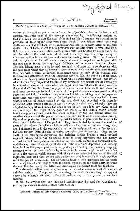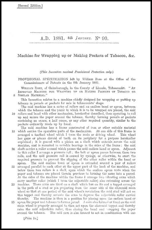 William Rose's original wrapping machine, for which he took out a provisional patent in 1881, was for packs of tobacco, which had hitherto been weighed and wrapped by hand. This development was looked on as something of a miracle, tobacco being the first commodity to be mechanically wrapped for sale.