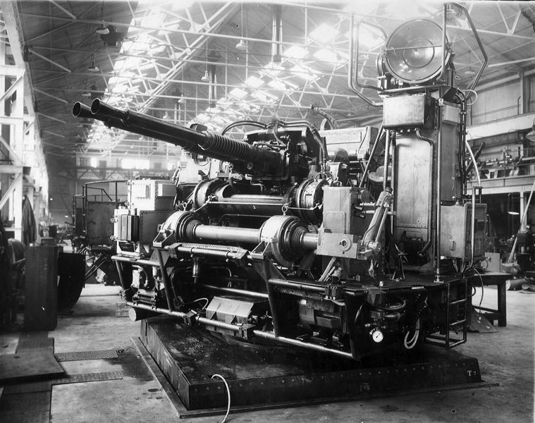 This unit is from UK wartime aircraft, and computed an aircraft's latitude and longitude using an entirely mechanical (analogue) process, involving integration, sines and cosines. The current speed and direction were fed in on servo-motors on the right of this photograph. The speed was split mechanically into sine and cosine components for latitude and longitude changes, and integrated to give the current position. The longitude calculation also needed an inverse "cosine" component (longitude changes more quickly nearer the poles proportional to the cosine of the latitude). The mechanical process would, of course, have failed near the north or south poles. The success of the new instrument brought orders for other pieces of equipment to be made at Saxilby - air-dryers, bomb-carriers, camera mountings, test-units and film processing machines. The STAAG GunRose's involvement in weapons production was not confined to working with the RAF. The firm's work for the Admiralty had begun during the 're-armament period' of 1937 and continued unbroken until 1985. The largest war contract executed by Rose Brothers, requiring the erection and equipping of a separate workshop, was for STAAG - designed in 1941 - twin Bofors guns on a stabilised platform rotating through 360 degrees with a very high elevation and low depression. STAAG first came into service on Royal Navy ships in early 1942. The STAAG.- standing for Stabilized Tachymetric Anti Aircraft Gun - was a very large twin-barrelled gun, that as the name indicates, was stabilised and carried its own tachymetric (predictive) fire control system capable of "locking on" to a target. Unfortunately, at 17.5 tons, this mounting was grossly overweight and the high-vibration of the gun mounting was a less than ideal location for sensitive valve electronics and mechanical computers. An ambitious weapon that was ahead of its time, STAAG was too difficult to maintain in the harsh environment of a warship and was later replaced by the Sea Cat missile. Rose produced STAAG mountings until 1959, the last one leaving the Works in November of that year. Post War DevelopmentsOne of the most significant post-war the development of the Rose Bearings business from the small beginnings in WW2 supplying rod-end bearings for a specific application on the RAF's Lancaster bombers (see here). NOTE: For the history of the development of the Rose Bearings business at Saxilby, see History of Rose Bearings, Saxilby. Another important venture at the time was the manufacture of Ambler Superdraft Textile spinning machines, the story of which is touched on at the beginning of the History of Rose Bearings, Saxilby. More will follow later.