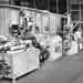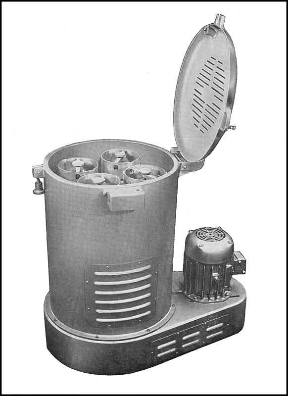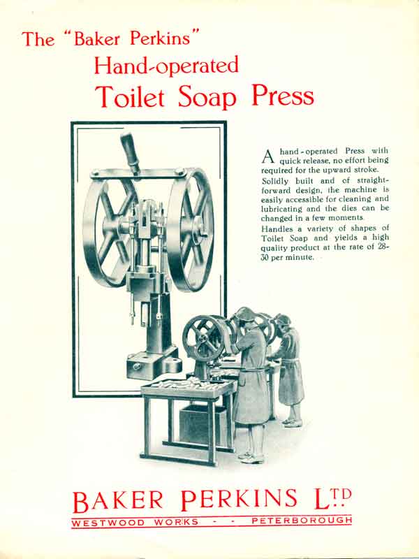 Soap machinery had been part of Baker Perkins’ catalogue since 1920 and the signing of the "Credo Agreement" between Joseph Baker Sons & Perkins and Savy Jeanjean et Cie of Paris, who manufactured chocolate and soap machinery but the earliest reference found on Customer Reference Cards is dated 1888. Also, many lines of Soap making equipment were sold to Lever Bros. at Port Sunlight from 1900 onwards. The Peterborough chemical division sold presses for stamping out bars of soap and the equipment for operating the Monsavon counterwashing process. The specialised tanks required for the Monsavon process were the only items that could be classified as chemical plant as opposed to machinery. It is thought that these came from the Savy Jeanjean association. Gordon Barker remembers - "The backbone of Baker Perkins' soap equipment was the Soap Plodder. This had a screw that tapered down from the feed to the discharge end, where a die extruded the blank tablet. that was then cut to length ready for pressing. The Plodder was fed from "Universal" mixers used for mixing the ingredients. The Jones (R.A. Jones,USA) 'K' Type was the main press of the industry. Soap tablets were fed to the press in the vertical position via an infeed conveyor on one side and discharged onto an take-off conveyor on the other side. The Single 'K' Press could produce 120 flat tablets per minute (For shaped tablets the output was lower). The single head machine had four pockets operating in sequence thus - blank tablet - tablet pressed - tablet ejected, pocket empty. A 'Duplex' version had two pockets at each station and produced 240 tablets per minute. Baker Perkins also made hand presses that stamped the tablet in the horizontal position". Many of the plants supplied by Baker Perkins included cartoning machines and these, too, were supplied by R.A. Jones who had a long-standing association with Rose Forgrove, Leeds - see here Peter Hornsby recalls (from around 1960) - "I can remember a soap tablet machine in the Chemical Demonstration Dept producing tablets of Palmolive.The units were called soap plodders and were built under licence from America.The units were fed with extruded blocks from a 3 or 4 to 1 heavily tapered extruder which I think we also made. A chip mixer churned out the mix of fats, perfumes and other additives to put in the extruder. I gather BP sold many machines and one I know went to Port Sunlight. The actual tablet compressor head had four soap tablet sized holes that were indexed round at speed with two small dies recessed to a makers design that closed rapidly compressing the tablet which were then ejected. I think it made one tablet every 3 or 4 seconds. It was dramatic to watch". In 1954, the Board of Management of Baker Perkins Ltd came to the conclusion that it should embark on a positive policy of expansion and in mid 1955 set up a Future Development Committee to review ways in which this could be carried out (See also History of Baker Perkins Ltd). A year earlier a study had been made of Baker Perkins Inc’s chemical machinery business (see also – History of Saginaw), which was operating successfully with a wider range of products to offer - heavy duty mixers, both batch and continuous, for many kinds of chemicals, including explosives and centrifuges - manufactured and sold under licence from Escher Wyss of Switzerland (and not available to Baker Perkins Ltd to manufacture or sell in England) - for the separation of liquids and solids. Two continuous mixers, designed specially for chemicals and plastics processing, had been added to the heavy duty "Ko-Kneader" line that was licensed from the inventor Heinz Liszt. Also, during WW2, Baker Perkins Inc had developed specialised mixers for rocket fuel and explosives.