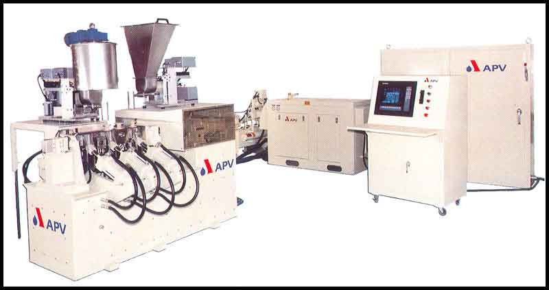 This mixing/extrusion technology was later developed to produce snack foods and breakfast cereals and became a very important part of Baker Perkins Ltd’s food machinery activities. At the Kunstoffe exhibition held in Dusseldorf in the following year, Stoke were able to show for the first time in Europe, their Mark 3 series compounder and palletising systems. It was claimed that the new development was suitable for processing colour and additive concentrates, engineering thermoplastics, fibre reinforced and mineral filled materials as well as rigid and flexible PVC. Mark 3 compounders were also installed in the customer demonstration laboratories at both Stoke and Saginaw. Guittard, Saginaw and Stoke collaborated in 1981 on the production of what was believed to be the only machine of its type in Europe – a salt grinder for use in the pigment industry. The design was based on the process typically used in pigment production in America where salt suspended in glycol is used. The glycol acts as a viscosity adjuster, at the same time allowing power adjustment in the batch, additions of glycol being used to control the viscosity of the batch. The salt effectively grinds like the balls in a ball mill but the salt is expendable: when the batch has been processed water is added which dissolves both salt and glycol. A filter press is used for separation, leaving only the finished pigment for collection. At the INTERPHEX exhibition held at Brighton in 1982, BPCM introduced their new "Novamix". Aimed at the cosmetics industry the machine was used in the preparation of face powders and powder-based eye-shadow formulations. Saginaw introduced, in late 1982, a radically new approach to palletising plastics. Combining their expertise in both plastics extrusion and centrifuge technology, the G-Force pelletiser utilised a spinning die to both extrude molten plastic and to cut the emerging strands into uniform pellets, using half the energy required by competitive palletising equipment. A twin-screw compounder discharged directly into the rapidly rotating (at between 2,000 and 4,000rpm) G-Force die. Centrifugal force extruded the molten material through holes in the rim of the die, each extruded strand being once per revolution as it passed a stationary knife. The pellets were then cooled in a water or air stream. The Institute of Polymer Technology at Loughborough University (founded in 1967 with funds from the plastics and rubber industries) needed a more technically advanced compounding system in 1986 to install in their laboratory. The laboratory already housed a unique range of equipment for polymer processing, testing and analysis where it trained students and solved industry problems. The trend in the industry towards more and more tailor-made polymers put pressure on the Institute to provide increasingly sophisticated compounding facilities. A Baker Perkins MPC/V30 laboratory scale compounder/extruder was chosen, complete with a package deal of screw components, was chosen as giving, in the words of the Institutes senior lecturer - “immediate and extensive flexibility – with optimum performance on different products”. With the opening of a new satellite factory on Newcastle under Lyme’s Parkhouse Estate, Baker Perkins Chemical Machinery Ltd installed the first link of its kind in Britain – an optical fibre connection with the powerful computer system at Peterborough. Provided by British Telecom, this link provided BPCM with immediate access to sophisticated software as a tool in design and manufacturing. In early 1986, Baker Perkins plc acquired Ownership of Sterling Extruder Corporation of New Jersey for just over £11 million. Sterling sold machinery and systems to the plastics processing industry and its products - blown film, blow moulding, sheet and compounding equipment for the plastics industry, together with wire and cable coating systems - were considered complementary to those made by the existing plastics machinery business centred on Saginaw. The merger with APV1987 saw the merger between Baker Perkins and APV. Of the previous Baker Perkins facilities, the huge factory at Saginaw, Michigan, purchased by Joseph Baker Sons & Perkins in 1919, was closed and as part of the new management’s first priority "to initiate action to eliminate losses, to improve margins in low return activities and to ensure that proper attention was paid to profitability throughout the enlarged group" and Sterling Davis was sold. The headquarters of the American chemical machinery business and the existing plastics machinery operations were moved from Michigan to New Jersey where a new Customer Demonstration Centre and development laboratory were built, manufacturing being transferred to APV Crepaco’s Lake Mills, Wisconsin factory. In 1987, the Chemical sub-group employed approximately 700, with full-service companies located at Saginaw, Michigan; South Plainfield, New Jersey; Edison, New Jersey; Stoke-on-Trent and Newcastle-under-Lyme, UK; and Paris, France. Marketing companies were maintained in Milan, Italy and Hanover, West Germany. The sub-group marketed its products to the rest of the world through local agents, many of whom were APV group companies. Telford Smith of Melbourne manufactured the first plastics extruder to be made in Australia just after WW2 and by the early 1950s, they were setting up complete lines to produce film, sheet, profiles and wire and cable covering. 1200 machines were at work all over Australia and New Zealand by 1989 when APV Baker Pty Ltd acquired the Company and formed a new division – APV Telford Smith. APV sold the Telford Smith business in July 1993. APV plc announced in September 1990 that it wanted to dispose of the Plastics machinery business and it was consolidated at the Edison facility. When, in December 1990, it was sold to Crompton & Knowles Corporation for $7.3m, APV was able to raise further funds from the sale of the freehold factory and office