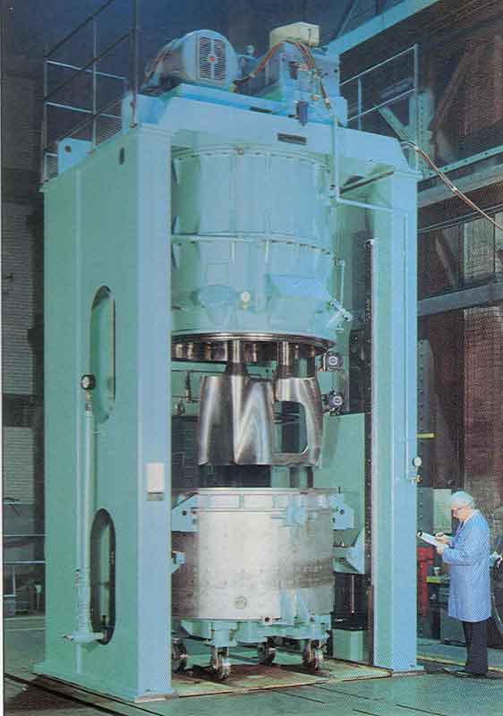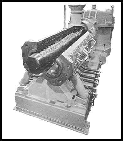 In the latter part of 1967, Baker Perkins Inc purchased the centrifugal business of the Podbielniak Division of Dresser Industries Inc, Dallas, Texas. The Podbielniak Contactor (the "Pod") was a world-renowned piece of machinery used in liquid-liquid extractions and separations complementing the solid-liquid centrifugal equipment already marketed by the Saginaw chemical division. Ideally suited for manufacture at Saginaw, the "Pod" broadened the company’s field of opportunity in the food, chemical and petroleum industries and allowed entry into the hydro-metallurgical and waste treatment industries. In many industries it is necessary to remove certain components, desirable or undesirable, from liquid solutions. This done by washing the liquids containing the substance to be removed with a chemical solvent, in what may be termed a "chemical washing machine". That, in brief, is the work of the "Pod" Contactor. "Pods" find applications in the pharmaceutical, petroleum and detergent industries among others. The "Oblicone" dryer was part of Steele & Cowlishaw’s range of high vacuum dryers. Two machines were supplied to ICI in 1968 each having a capacity of 150 cu. ft. and working at 250 degrees C under a vacuum of 1 torr. The Werner & Pfleiderer AgencyWerner & Pfleiderer was a prominent German machinery manufacturer with headquarters and works located at Stuttgart-Feuerbach, with whom Baker Perkins had a long association (see also Baker Perkins and Werner & Pfleiderer - The European Limited Partnership). Around 1968, WP parted with their then agent in the UK, Kimball and Company, and appointed Baker Perkins to act as agent for the WP range of continuous compounding machines for processing thermoplastic polymers such as polypropylene, polystyrene, polyethylene, etc. WP found that twin-screw extruders (ZSK) offered a number of advantages over conventional single screw machines, especially for the more complex compounding applications. These ZSK machines incorporated a number of advanced features such as co-rotating, closely intermeshing screws assembled from various different segments (e.g. screw bushings, kneading discs, etc.), which were keyed onto the bare shafts. By this means, it was possible to build up a screw configuration of great flexibility, tailored to suit the particular requirements of complex processes. Process variables such as kneading intensity, mixing input and retention time could all be closely controlled by selecting the appropriate type and sequence of screw segments. Likewise, the extruder barrel was built from a series of figure-8 shaped sections that could be bolted together to enable machines of different processing length to be assembled. Some sections incorporated vent ports for venting gases released during processing. The barrel sections were each drilled for independent water circulation, so that heating or cooling could be provided at exactly the right point as the polymer proceeded along the length of the barrel. Typically, an extruder multi-hold die plate with a rotating pelletiser device could be fitted to the discharge end of the ZSK to provide a continuous discharge of discreet plastic pellets as the end product. These machines, although highly expensive, were technically sophisticated and offered unique features. This was recognised by the major plastic and chemical producers and processors throughout the world and they were widely adopted in the UK by Shell Chemicals, BP Chemicals, Porvair and many other leading producers in the plastics industry. Mention should also be made of the Plastificator PK machine, which found a ready market in the UK. This machine was developed specially for processing Plasticised Polyvinyl Chloride (PVC). The design was very ingenious. It employed a ribbed, conical rotor assembled in a closely fitting conical housing. The rotor was capable of small movement along the horizontal axis thereby increasing or decreasing the gap between the rotor and the fixed housing. The narrower the gap, the more work done and vice versa. In this way, it was possible to control very carefully the intensity of the work done on the polymer, which was important for applications such as incorporation of colour pigments. A New Chemical and Foundry Division is formedA new Chemical and Foundry Division was formed at Westwood Works from Jan 1 1970, with R.C. Dean – divisional manager, J.C. Hucklesby – technical manager, A.W.D. Ferns – manager W+P equipment sales, J.H. North Sales Manager and G.C. Chestney – office manager. The two parts of the business carried on as separate entities under one roof and while this history continues with the development of the group’s chemical machinery activities, the story of the Foundry business is told at length in History of Baker Perkins in the Foundry Business. By this time, Baker Perkins were out of the soap machinery market – this sector having been taken over by Italian competition. In 1974, the decision was made by BP to disengage from the WP agency agreement in the UK and WP subsequently set up their own subsidiary company in the UK, which continued to offer machines imported from Stuttgart. The era of the WP agency in the UK was considered to be an interesting and memorable period for all concerned and marked a close practical co-operation between Peterborough and Stuttgart. The Largest Twin-Screw Reactor in The WorldThe largest twin-screw reactor to be built anywhere in the world to that date was shipped form Baker Perkins Inc’s Saginaw factory in 1969. One of a pair built for one of the world’s major chemical companies, it weighed 100 tons and was driven by an 800 HP motor. The two stainless steel rotating screws were 35 inches in diameter. Saginaw received the John C. Vaaler Award from Chemical Processing magazine for this achievement. This was the second time in two years that Saginaw had been given this Award. Also in 1970, Saginaw produced a 200 gallon, 200 HP dispersion mixer for grin